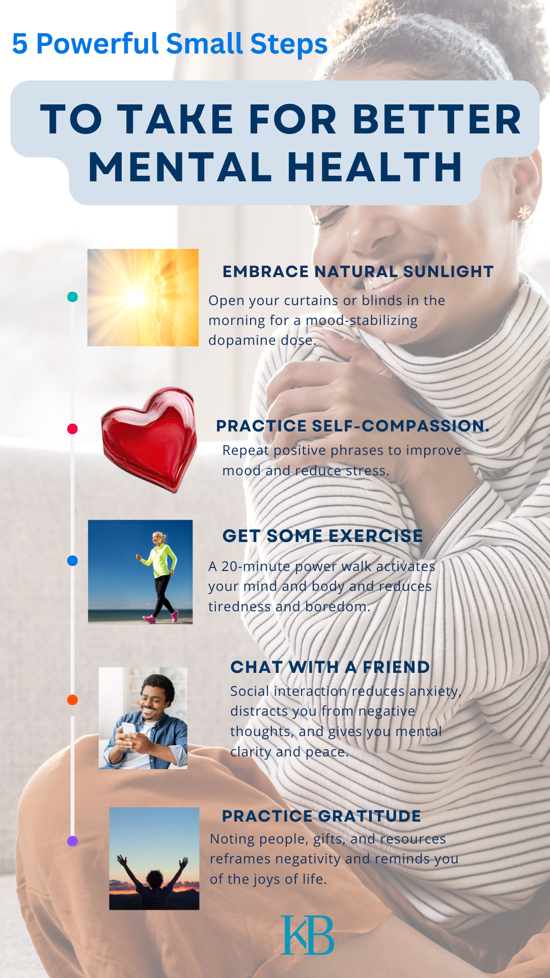 And since I'm writing about wellness tips, I'll share five that are perfect for a day you need a pick-me-up. Take a look at this graphic, "5 Powerful Small Steps to Take for Better Mental Health." Start every day with a quick reminder that none of us are perfect, and we need some solid advice for boosting mental clarity, and on a day to day basis.