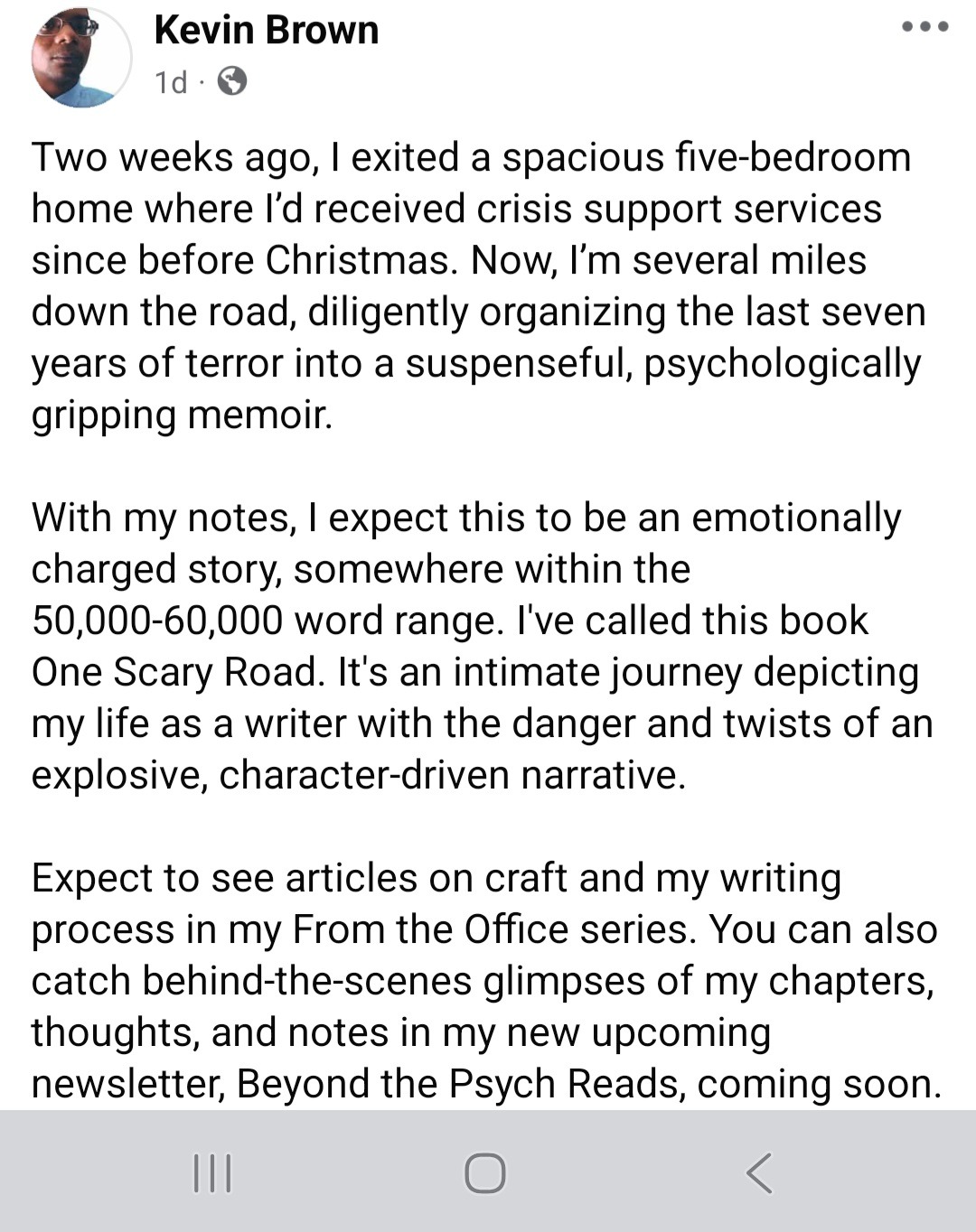 Many of these experiences draw from material I've gathered for my first memoir, which I discussed briefly in a recent Facebook post I wrote on one of several books I'm writing.