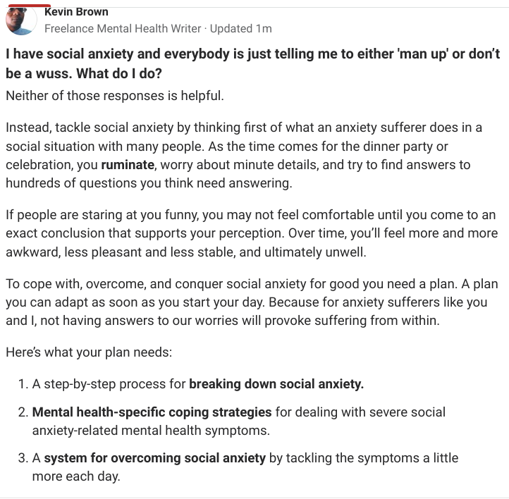 My blog posts teach readers how to solve problems related to stress management, living with a mental illness, coping, being a self-advocate, recovery, and self-improvement, Keep subscribers entertained while motivating them to improve their mental health and live healthy, fulfilling lives.